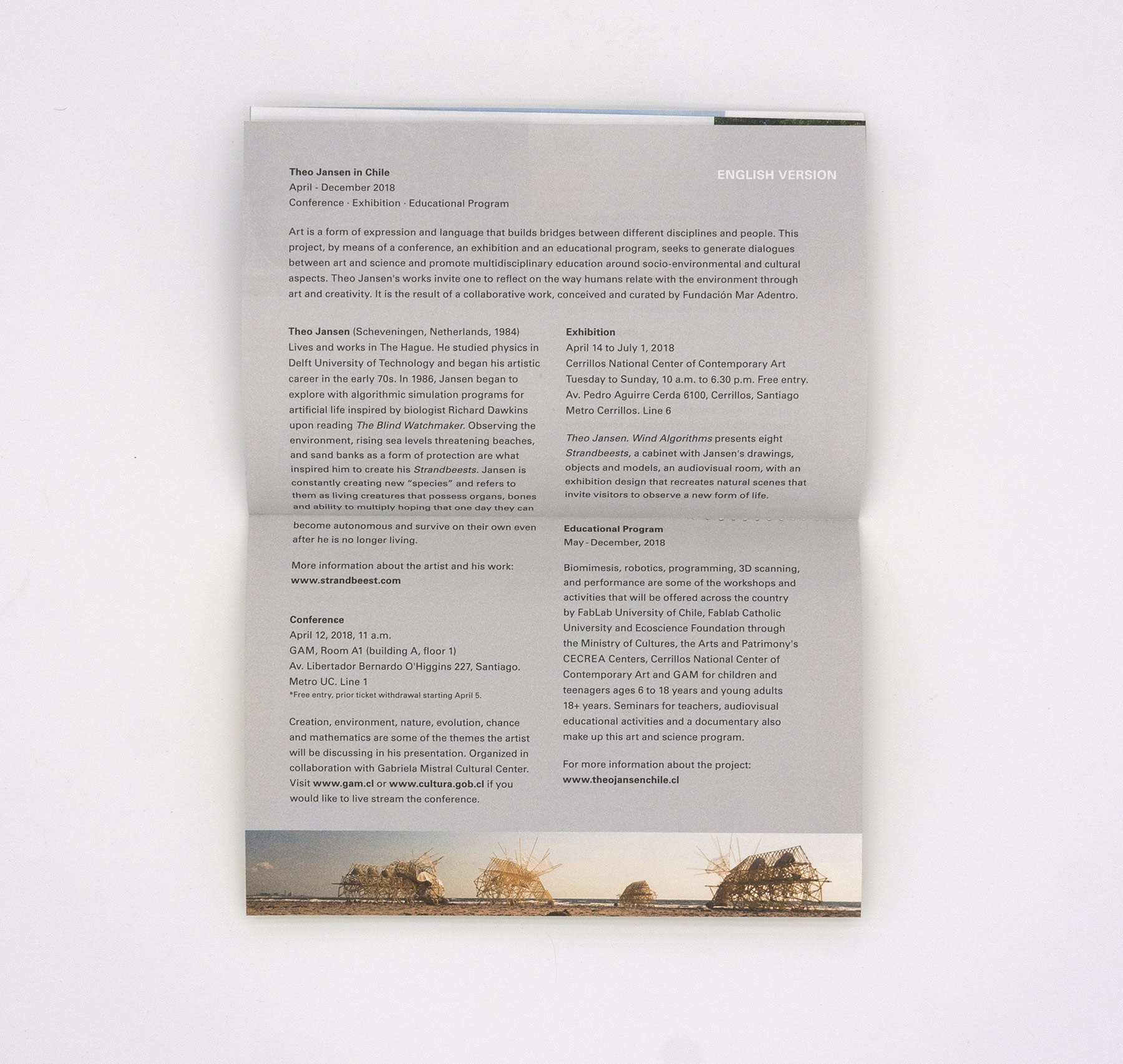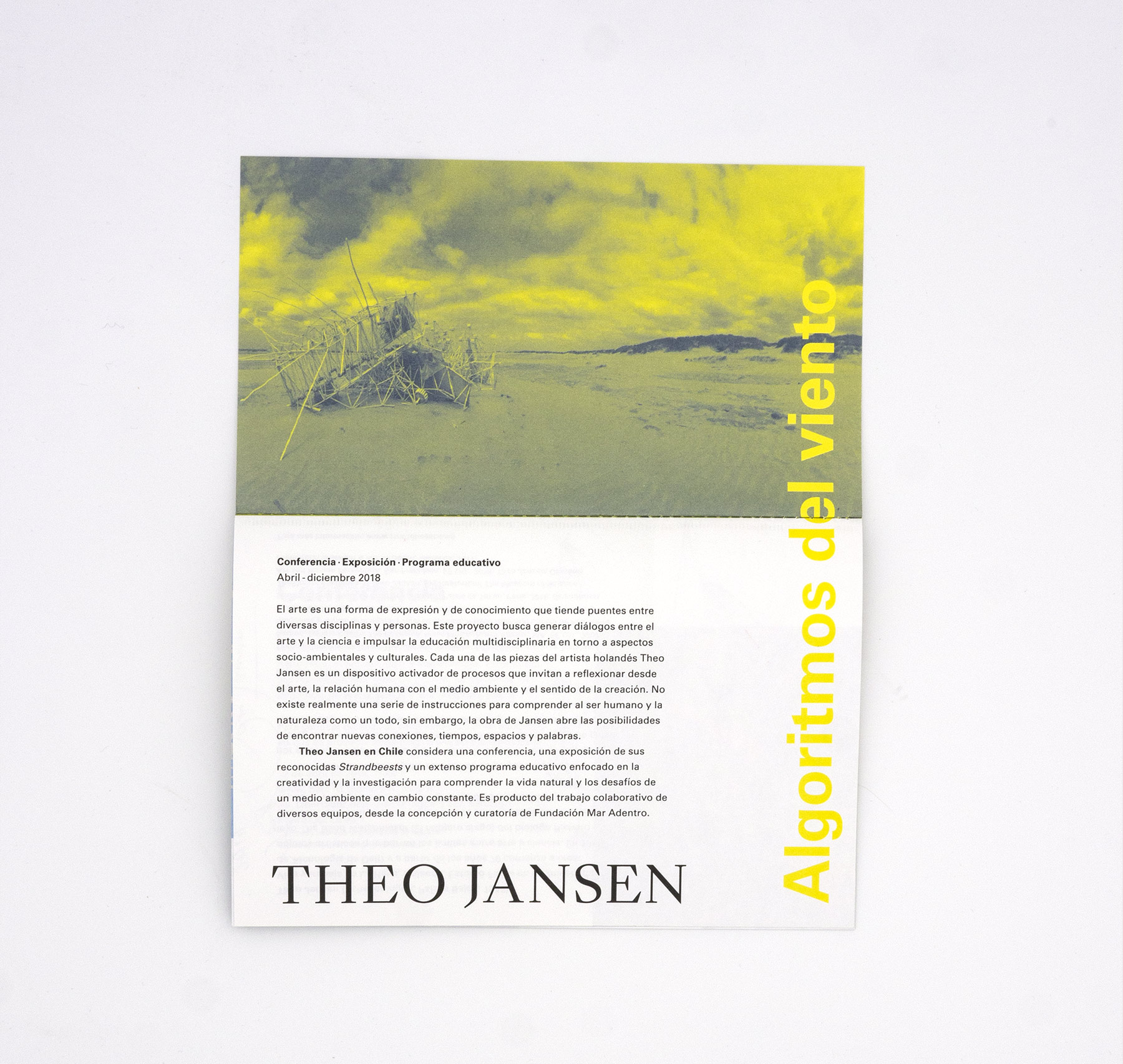 Programa en formato libro para la exposición e invitación a conferencia «Algortimos del viento» del artista Theo Jansen. El diseño utiliza la identidad visual de «Algortimos del viento», entregada por el cliente.